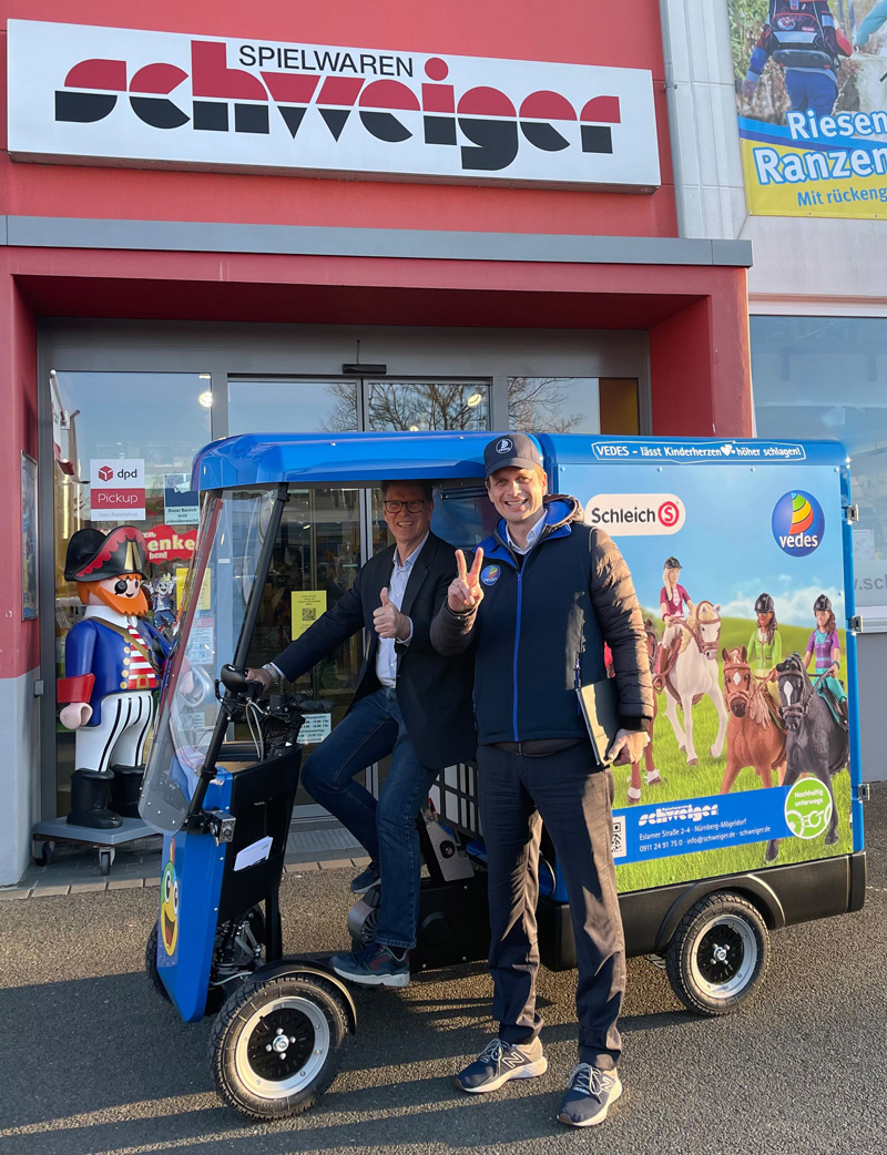 Erster Einsatz für das brandneue VEDES E-Cargo-Bike: Neues Promotion-Highlight bei Spielwaren Schweiger in Nürnberg